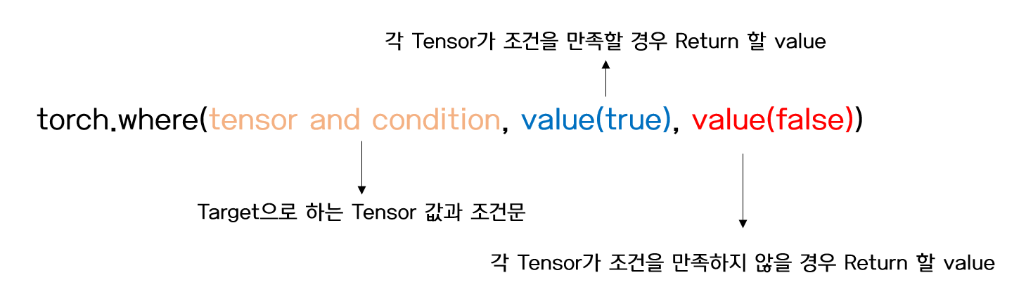 torch.where()함수는 첫번째 인자로 Target으로 하는 Tensor 및 조건문, 두번째 인자로 해당 Tensor의 각 객체가 조건을 만족할 경우 Return할 Value, 세번째 인자로는 해당 Tensor의 각 객체가 조건을 만족하지 않을 경우 Return할 Value를 필요로 한다.